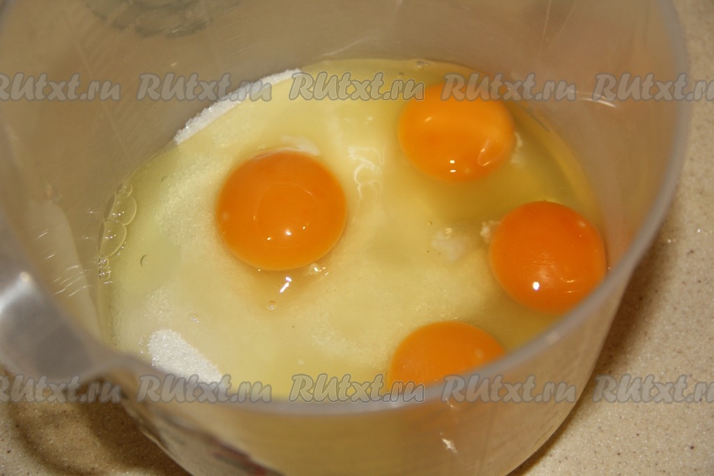 В достаточно глубокую ёмкость, удобную для взбивания миксером, насыпать сахар, добавить яйца.