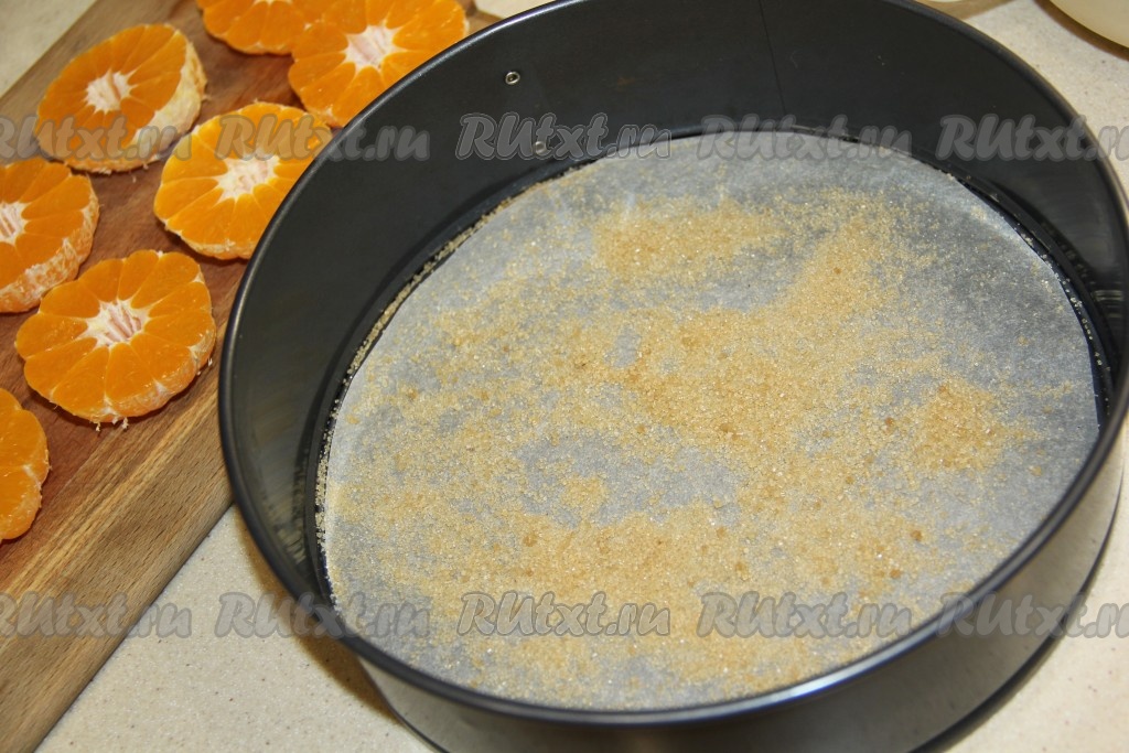 Форму (у меня разъёмная форма диаметром 24 см) застелить пергаментом и присыпать 1 столовой ложкой коричневого сахара.