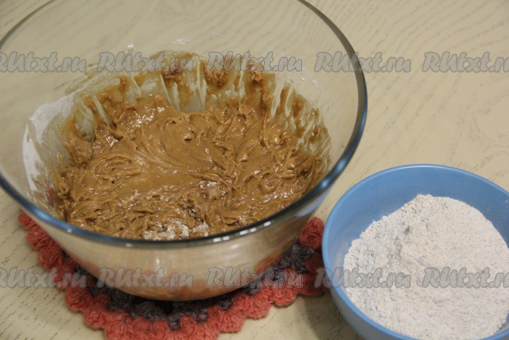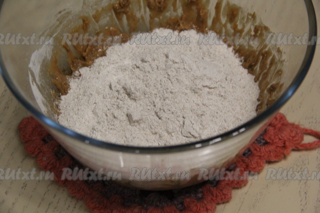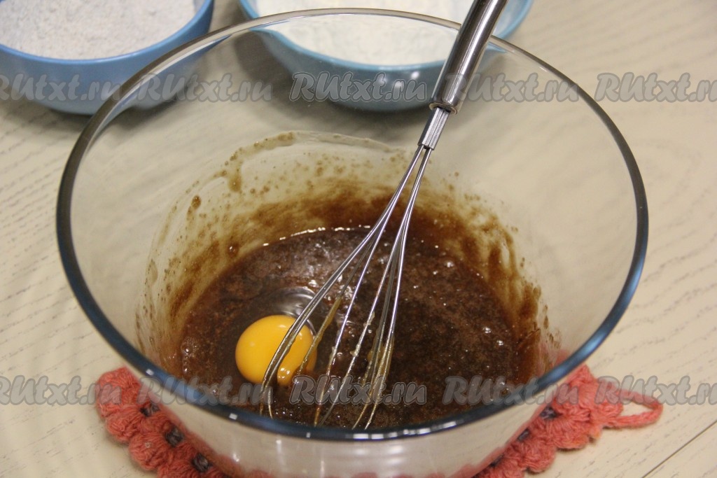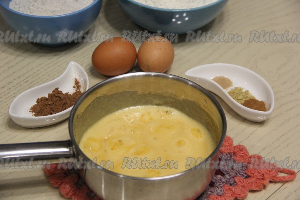 Получившуюся пряную массу перелить из сотейника в миску для замеса теста и немного остудить. Всыпать какао и перемешать венчиком.