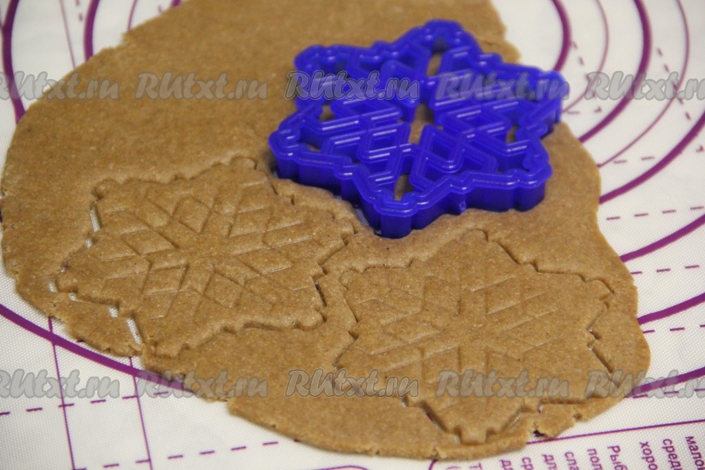 На припылённой мукой поверхности раскатать тесто скалкой в пласт толщиной 7-8 мм. Вырубить пряники любой формы.