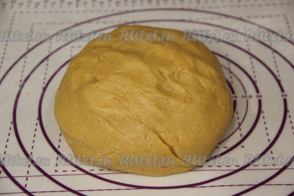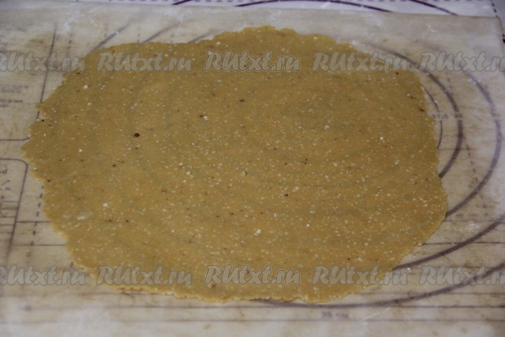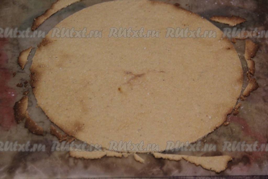 Переложить пергамент (или коврик) с тестом на противень, отправить в разогретую до 180 градусов духовку и выпекать, примерно, 5 минут (до лёгкого золотистого цвета). Горячий корж сразу переложить прямо на пергаменте на стол и обрезать по контуру тарелки.