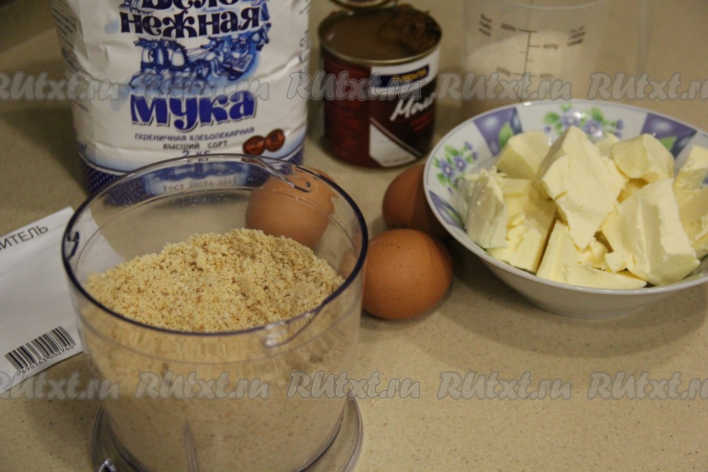 Обрезки от коржей сложить в чашу блендера и измельчить в крошку.