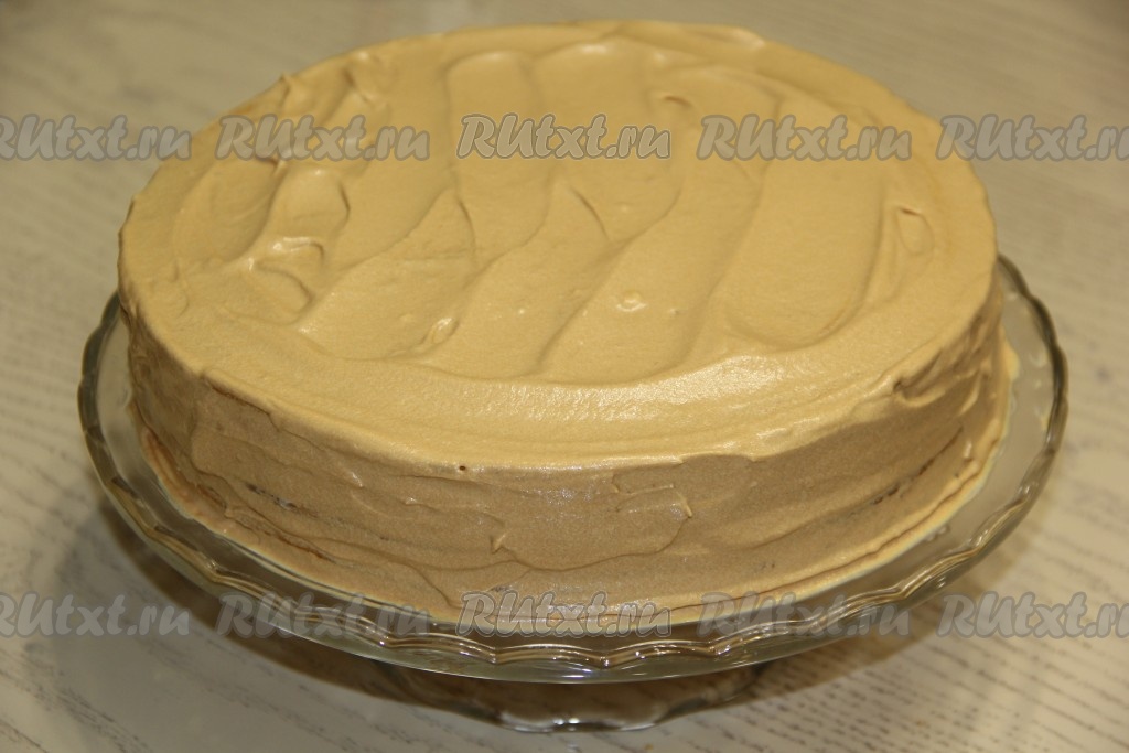 Затем коржи выкладывать один на другой, смазывая каждый корж кремом. Верх и бока торта тоже смазать кремом. Поставить арахисовый торт в холодильник на ночь.