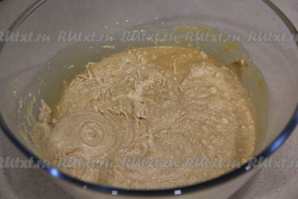Добавить разрыхлитель и 200 грамм муки, перемешать.