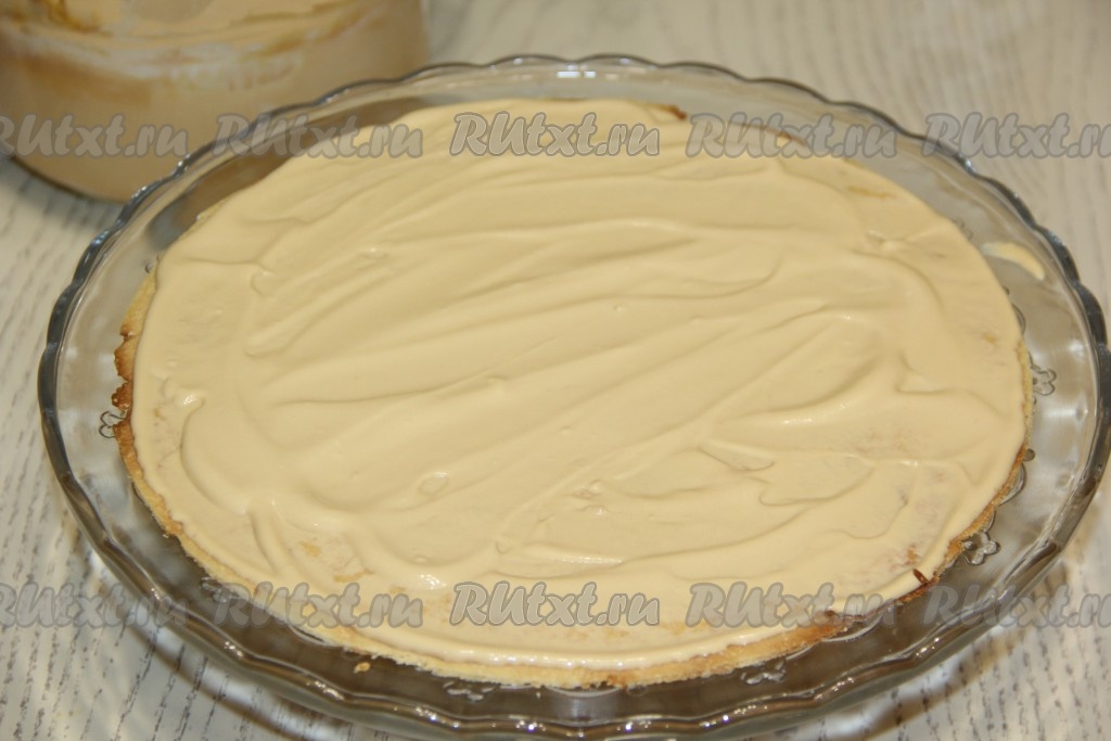 Теперь можно приступать к сборке арахисового торта "Коровка". Для этого на подставку для торта (или на плоскую тарелку) нужно выложить первый корж, смазать частью крема.