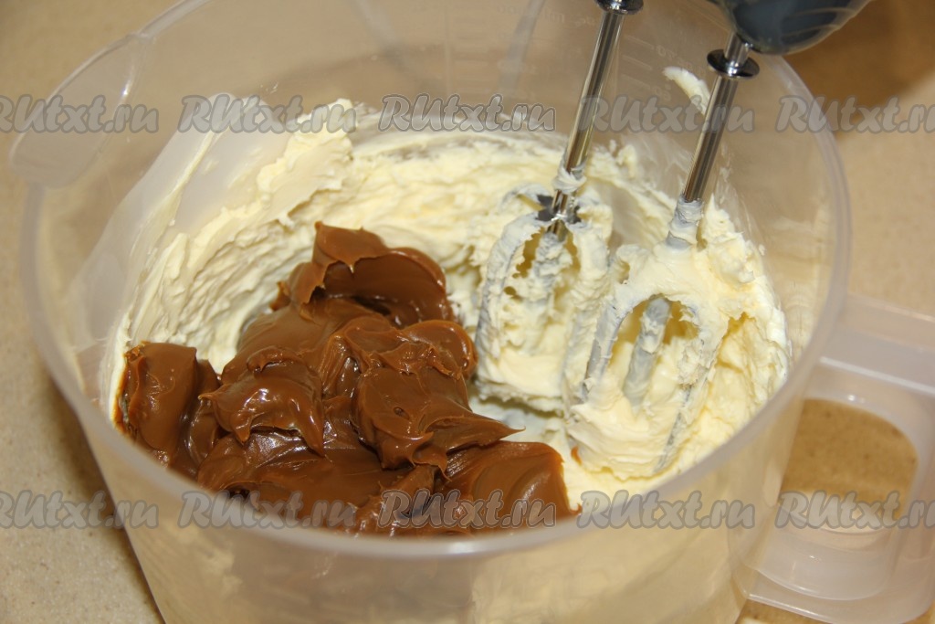 Добавить варёную сгущёнку и взбить в течение 1 минуты.