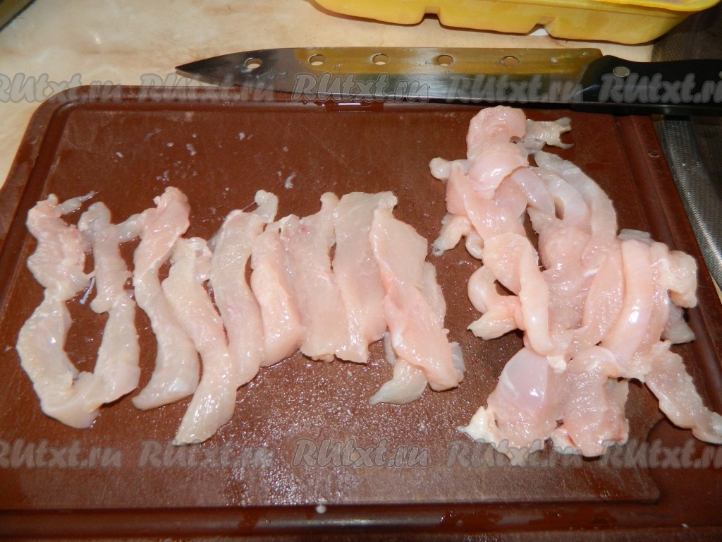 Курицу моем, режем на длинные полосочки, потом слегка посыпаем их крахмалом.