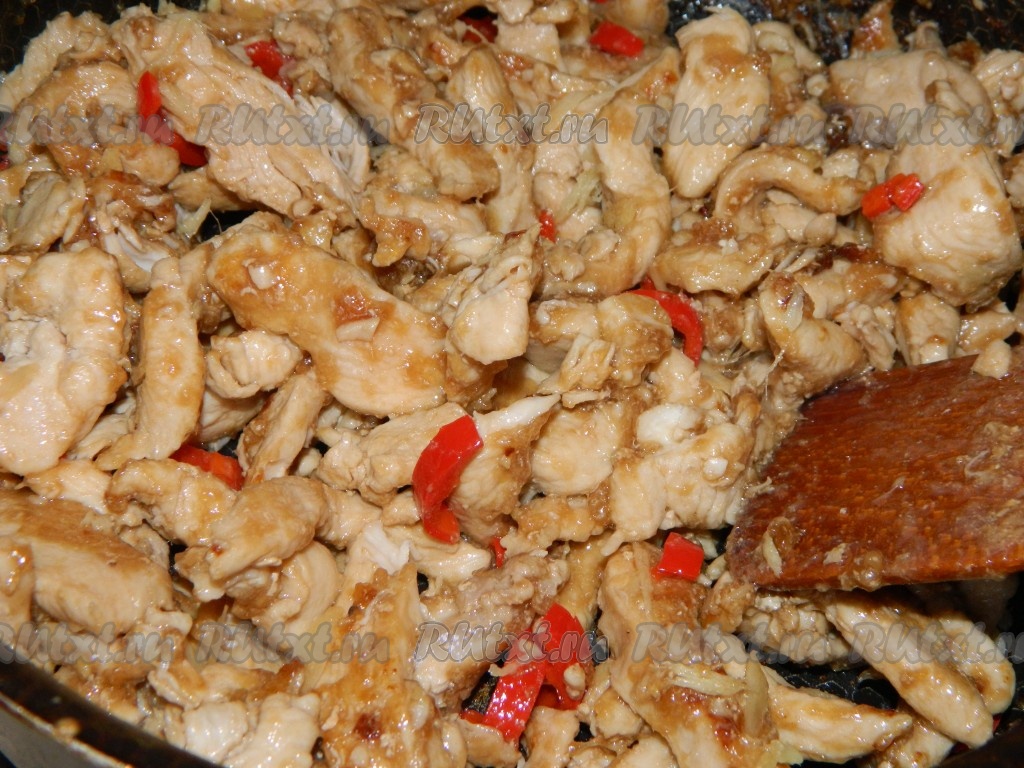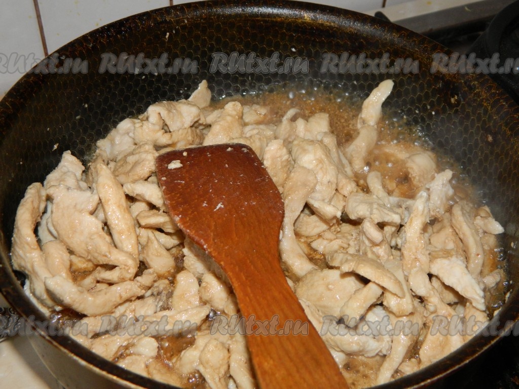 В сковороду наливаем растительное масло, выкладываем филе и жарим на сильном огне 3-4 минуты, постоянно помешивая, затем убавляем газ.
