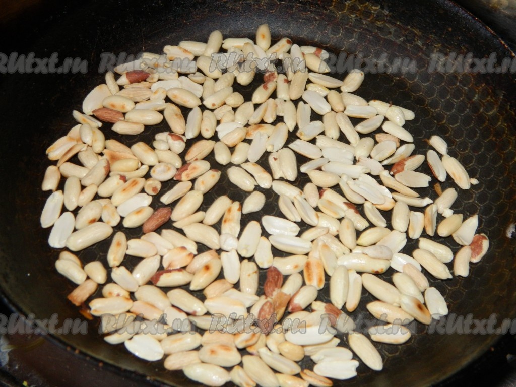 На горячей сковороде без масла слегка подрумяниваем арахис.