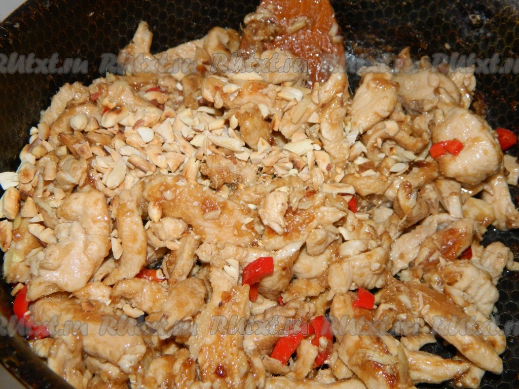 Добавляем порезанный арахис к курице, все хорошо перемешиваем и жарим до готовности.
