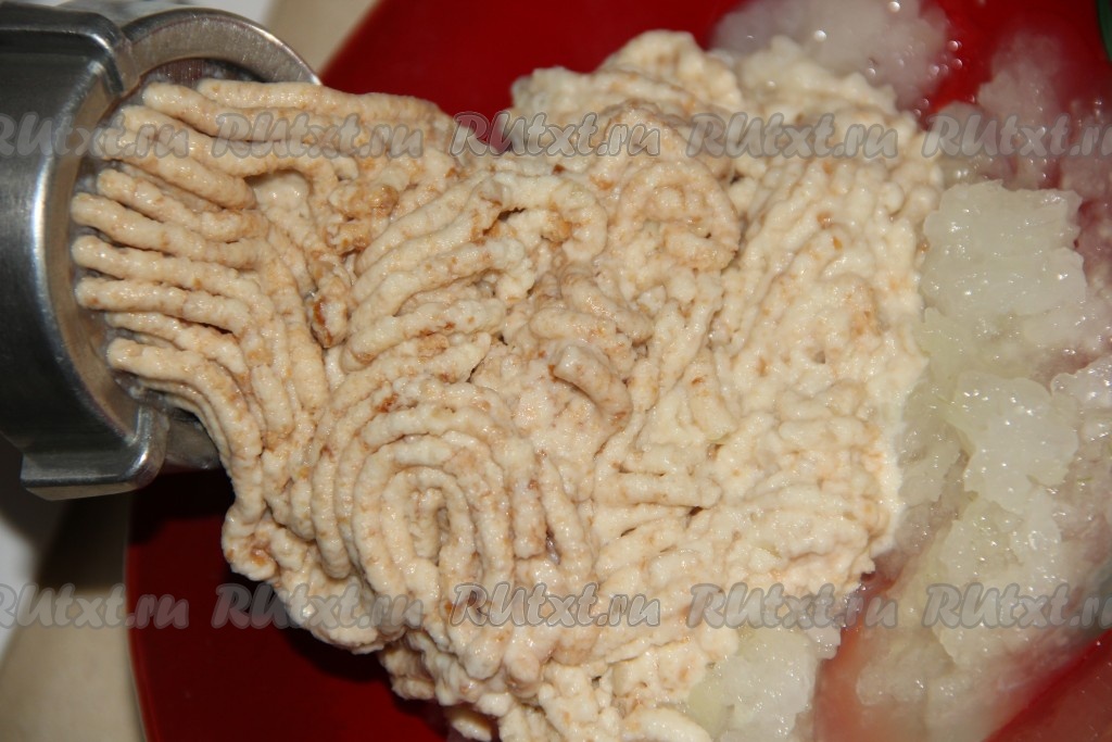 Хлеб предварительно вымочить в молоке, затем отжать от лишнего молока и пропустить хлебушек через мясорубку.