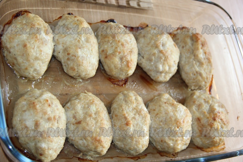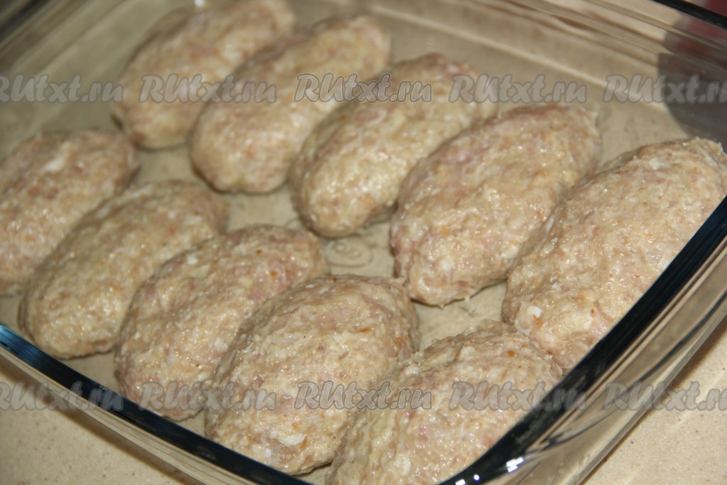 Хорошо вымесить фарш и сформировать продолговатые котлеты. Можно пожарить котлеты, но я запекла их в разогретой духовке при температуре 220 градусов в течение 25 минут. На дно формы перед запеканием котлеток я налила немного воды, поэтому котлеты получились паровыми.