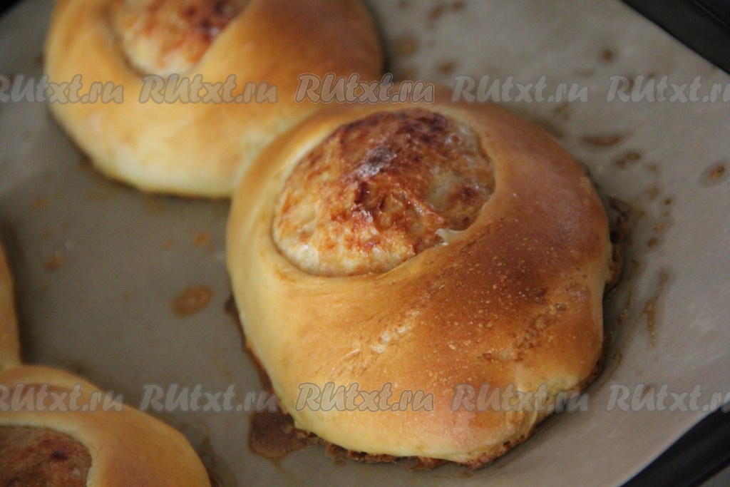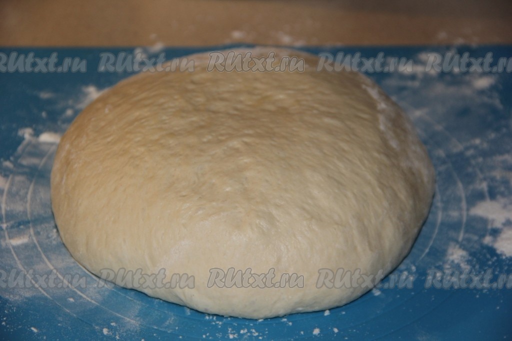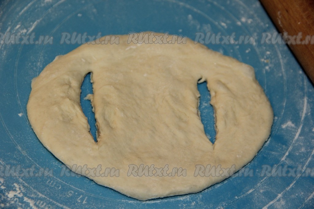 Подошедшее тесто обмять и разделить на кусочки. Размер кусочков теста будет зависеть от размера ваших котлет. На присыпанной мукой поверхности каждый кусочек теста раскатать в круг, не тонко, и сделать два надреза по бокам (как на фото).