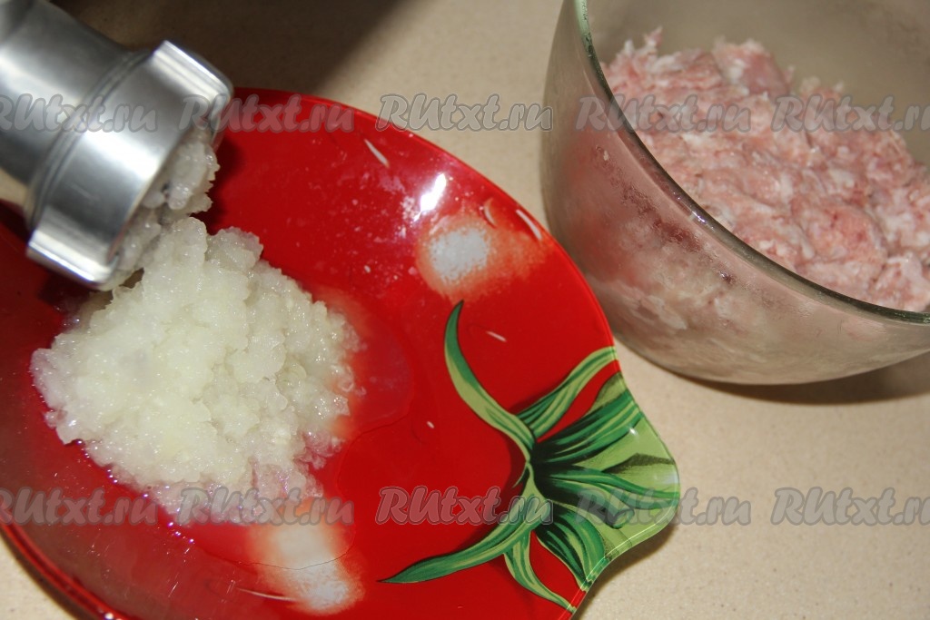 Пока тесто подходит, приготовить котлеты. Фарш можно использовать покупной или пропустить мясо через мясорубку. Лук почистить и тоже пропустить через мясорубку.