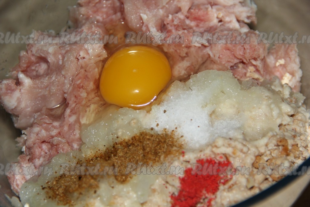 Добавить соль, специи и яйцо.