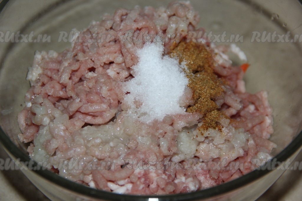 Половину очищенной луковицы и кусочки мяса (я взяла кусочки куриного филе) пропустить через мясорубку, добавить специи и соль, тщательно перемешать получившийся фарш.