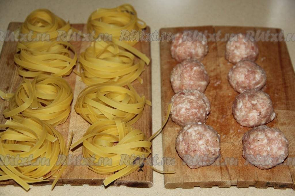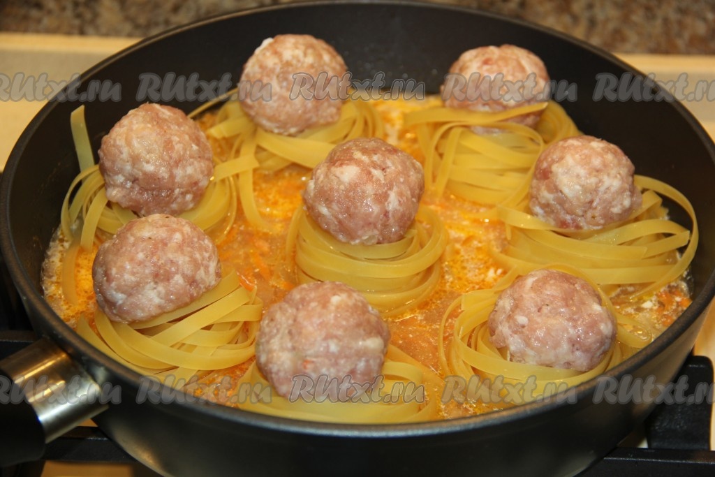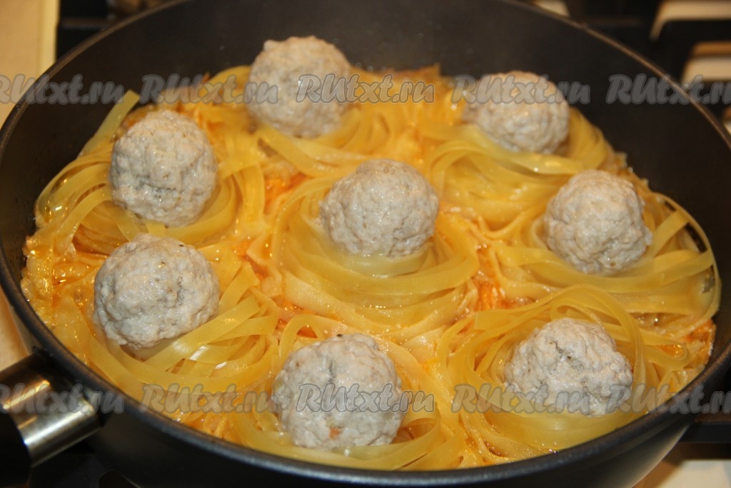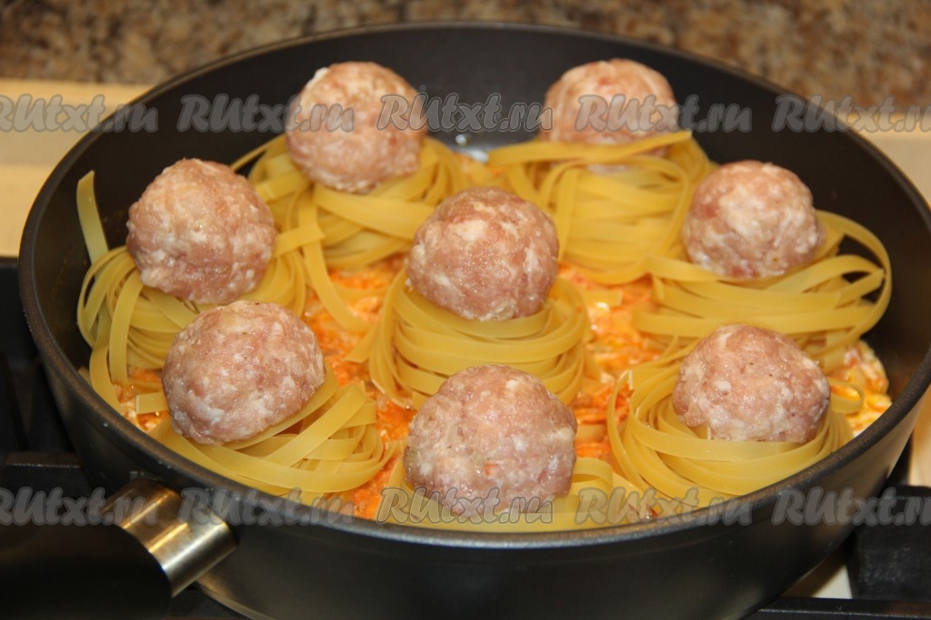 На сковороду поверх овощей выложить макаронные гнёзда, а в середину каждого гнездышка поместить по одной фрикадельке из фарша.