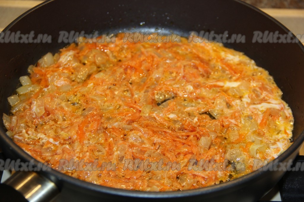 Когда лук обжарится до прозрачности, добавить очищенную морковку, натёртую на крупной тёрке, перемешать и обжарить, помешивая время от времени, минут 5.