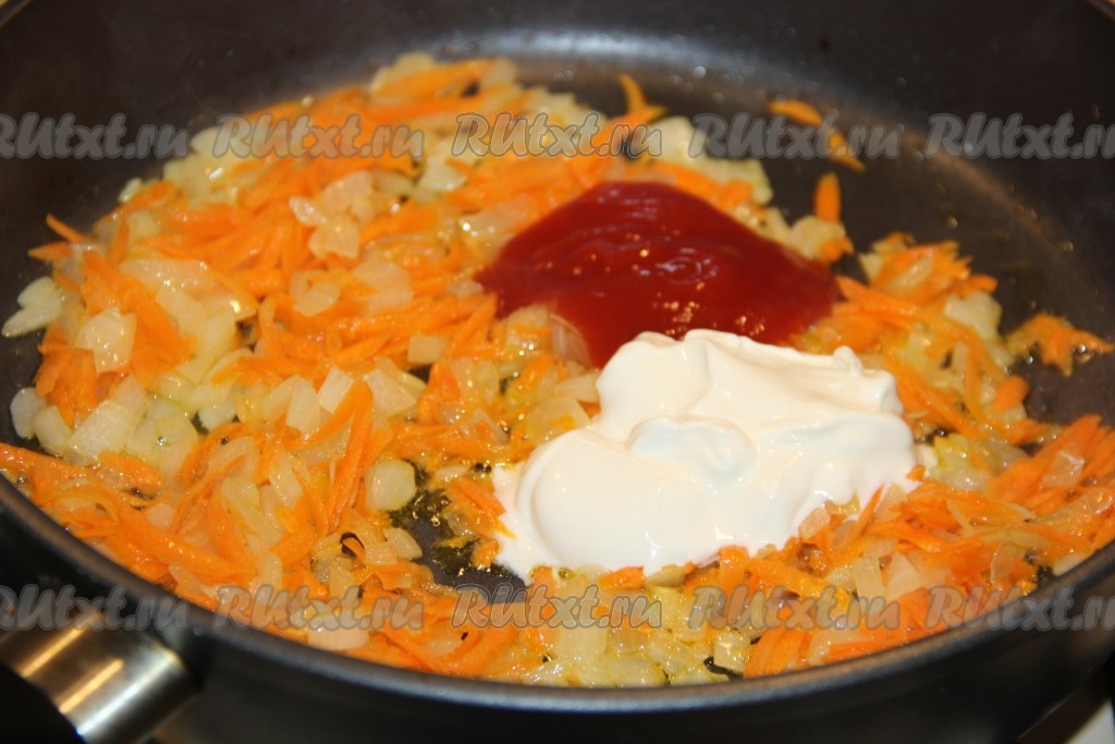 В сковороду с обжаренными морковкой и луком выложить сметану и томатную пасту.