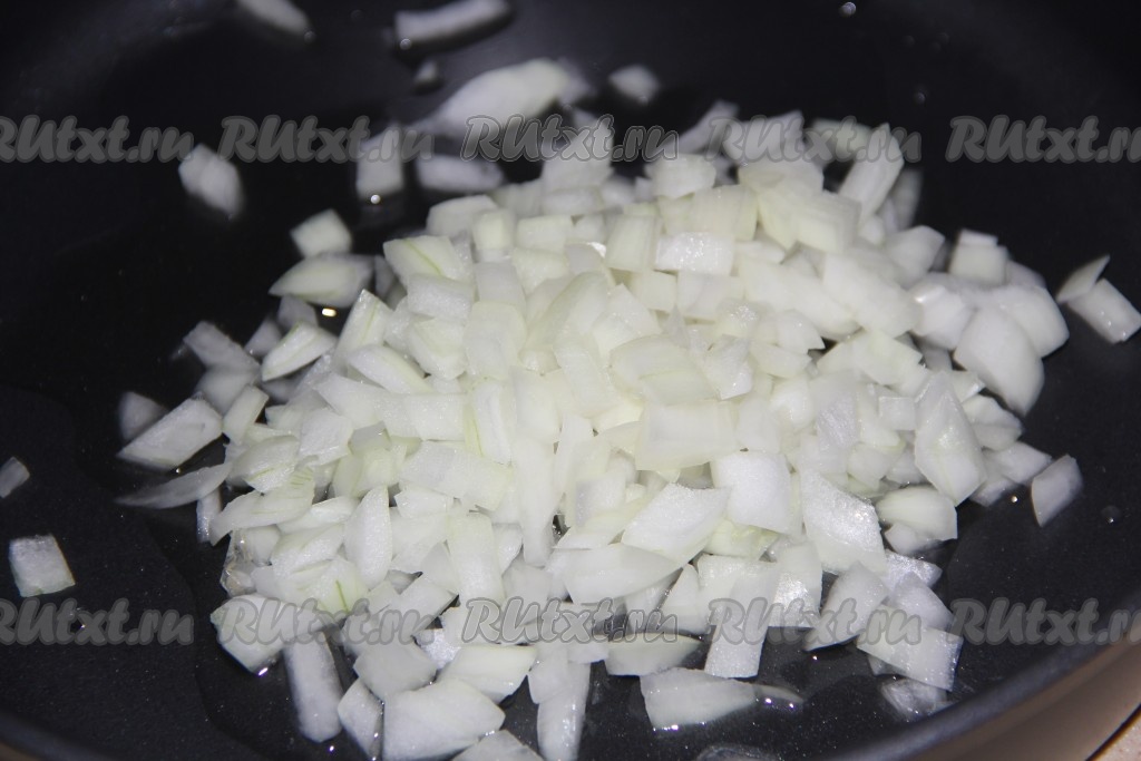 В сковороду с высокими бортиками влить растительное масло, выложить 1 очищенную и мелко нарезанную луковицу, обжарить, помешивая, на среднем огне до прозрачности.