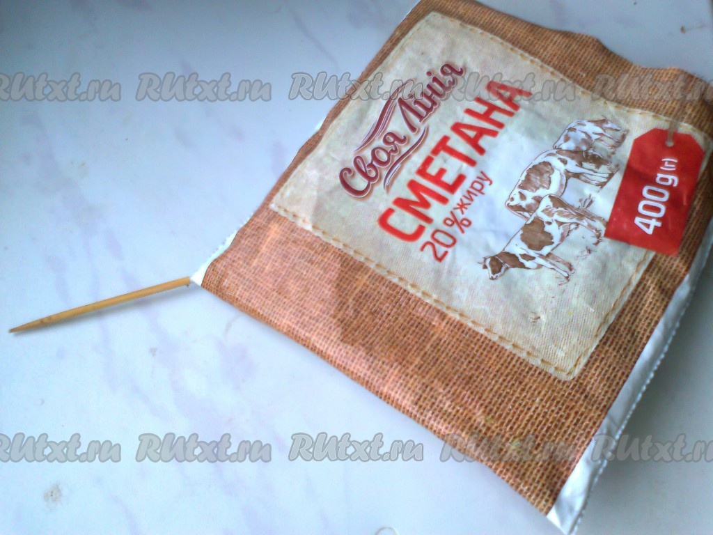 В углу пакета от сметаны сделать шпажкой для шашлыков (или зубочисткой) отверстие.