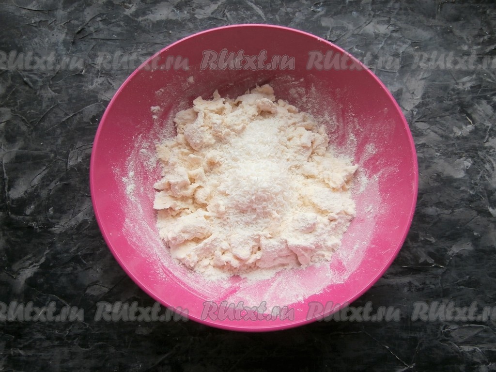 Перетереть получившуюся массу немного руками, всыпать 20 грамм кокосовой стружки.