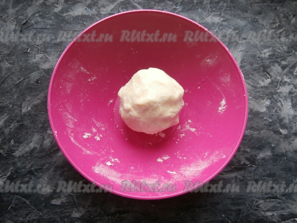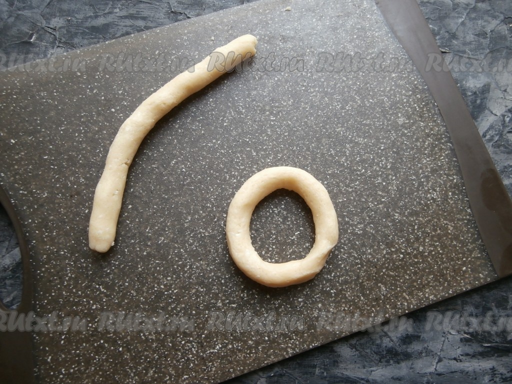 Каждый кусочек теста скатать в жгутик длиной около 15-16 см (тесто довольно рассыпчатое, его нужно греть руками, чтобы получились довольно гладкие жгутики). Свернуть каждый жгутик в кольцо, защипнув вместе края.
