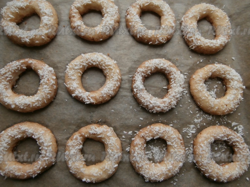 Сверху посыпать песочное печенье кокосовой стружкой.