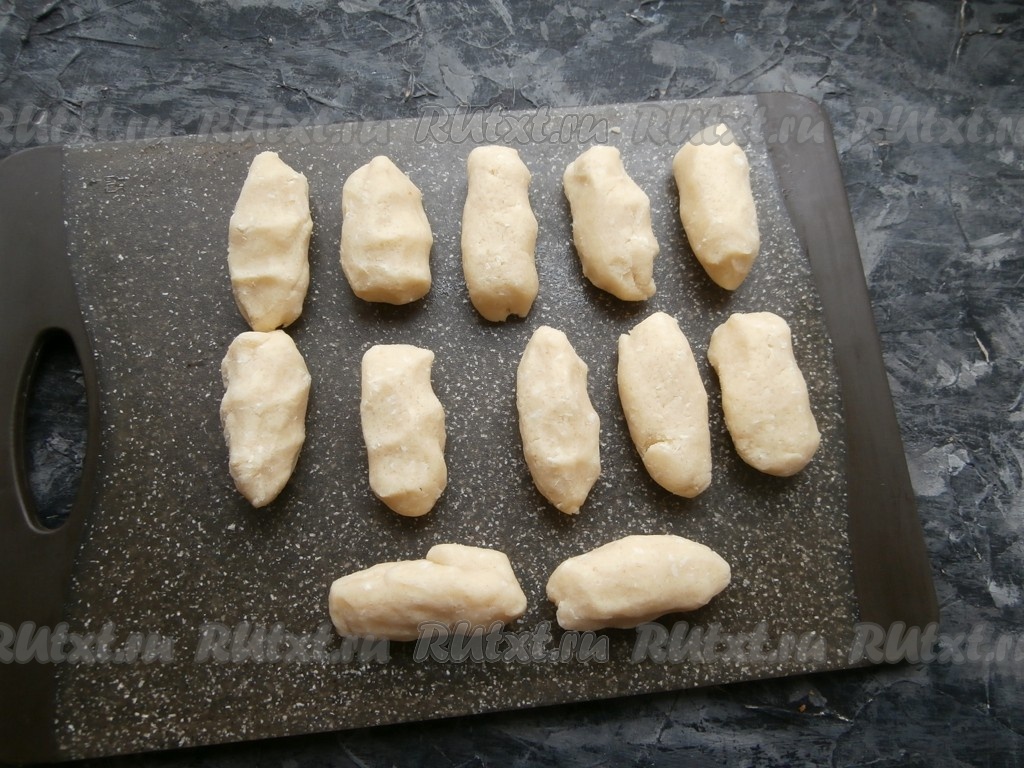 По прошествии времени разделить песочное тесто на 12 частей и, разминая каждую часть в тёплых руках, сформировать кусочки в виде пальчиков.