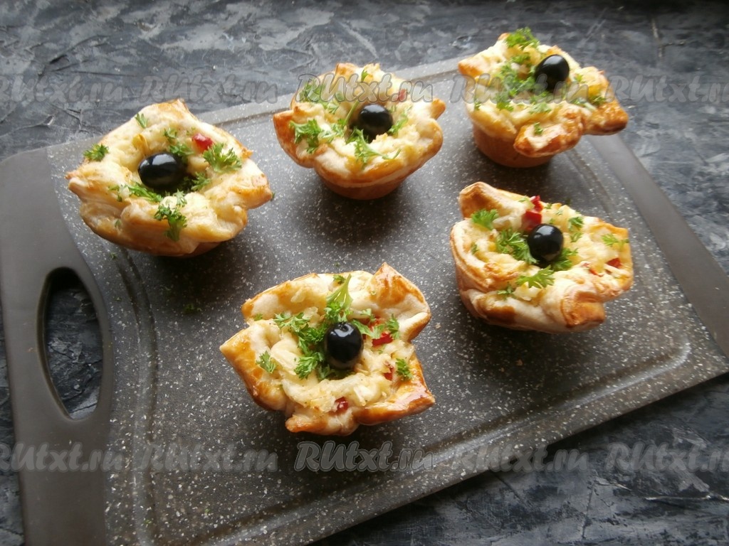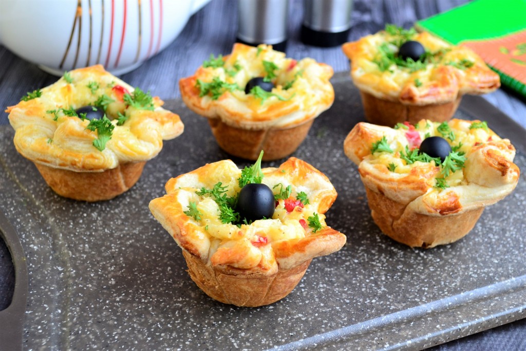 Подавать красивые и очень вкусные корзиночки из слоёного теста с сырной начинкой к столу в горячем виде.