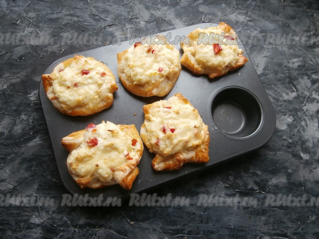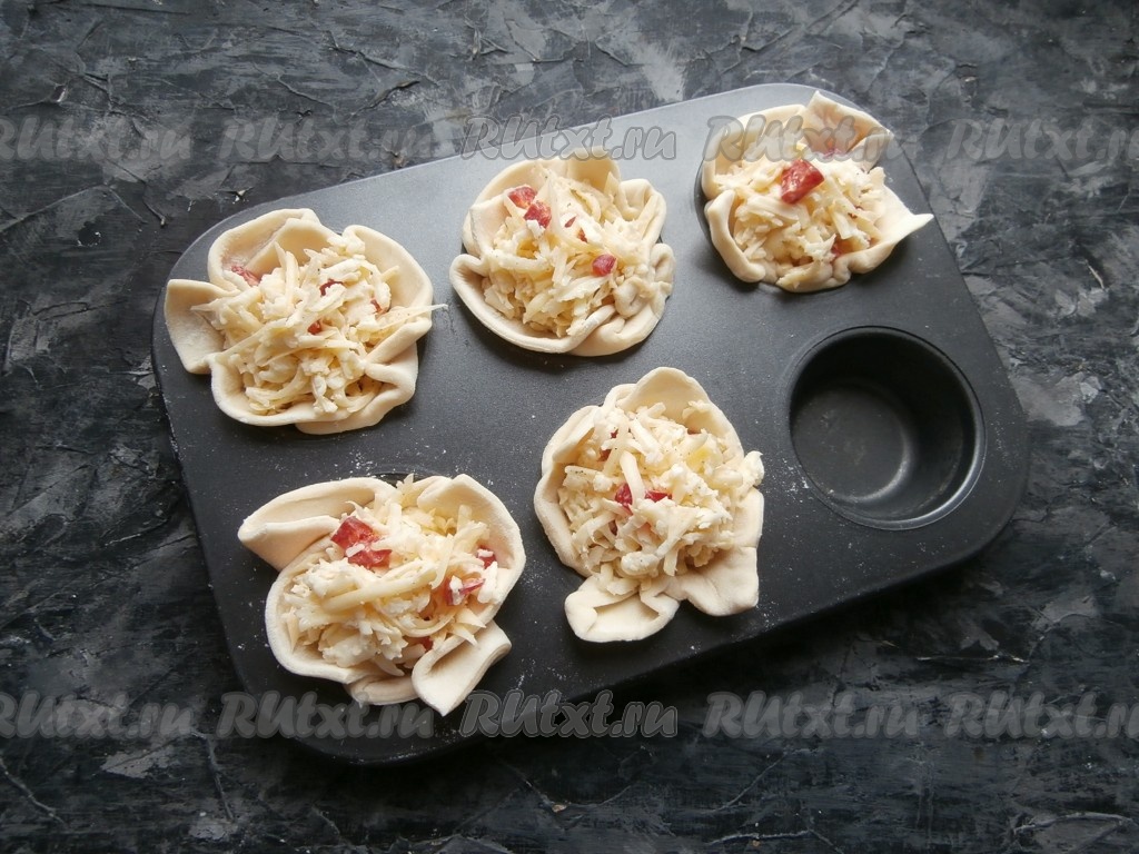 Каждую корзинку из слоёного теста плотно наполнить сырной начинкой, чтобы она была горкой.