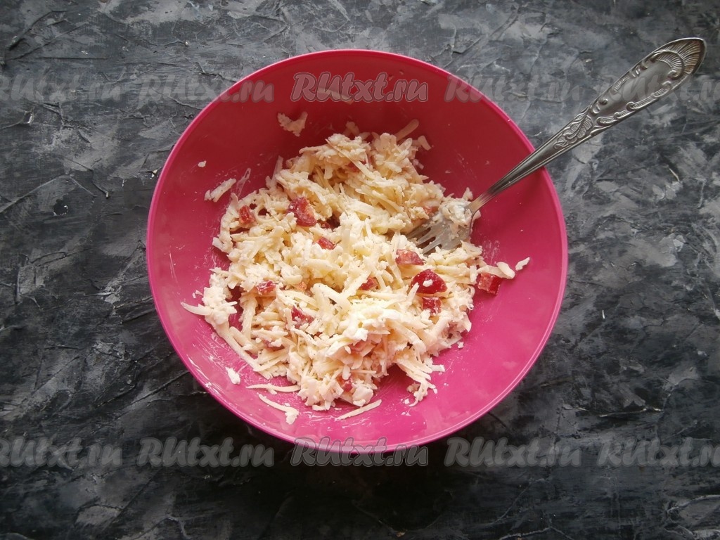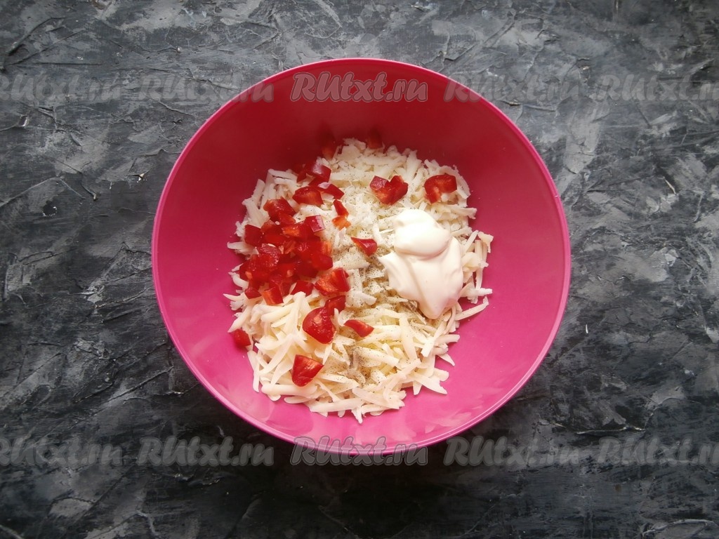 К сыру добавить чёрный молотый перец, майонез и, по желанию, очищенный от семян и мелко нарезанный болгарский перец.