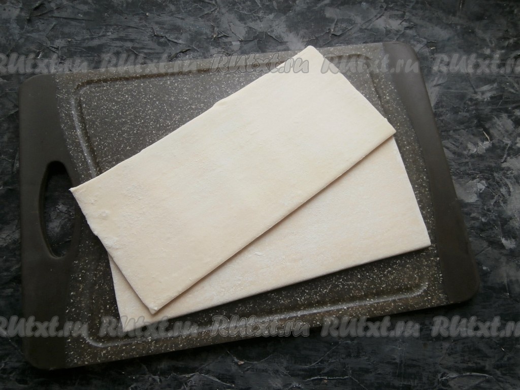 Нарезать тесто на квадраты размером 10 см х 10 см. Каждый квадрат на поверхности, присыпанной мукой, немного раскатать, чтобы квадраты стали тоньше.