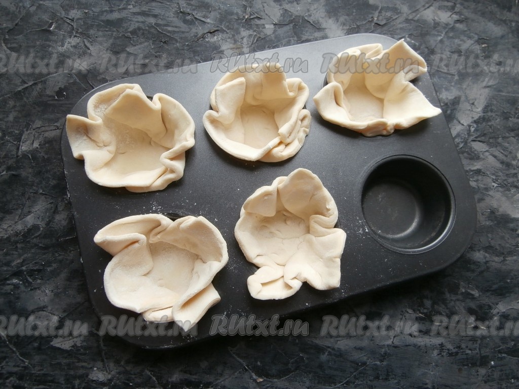 В форму или формочки для кексов поместить квадраты теста, формируя корзиночки. Можно предварительно смазать форму маслом, чтобы выпечка не пристала, я не смазывала, так как использовала форму с антипригарным покрытием.