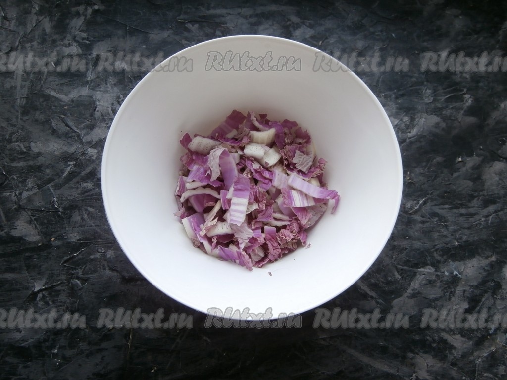 Пекинскую капусту вымыть, нарезать на кусочки. Для приготовления блинчиков отлично подойдут толстые части капустных листов.