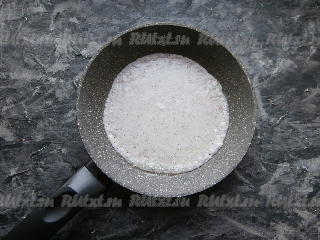 Блины из пекинской капусты желательно выпекать на сковороде с качественным антипригарным покрытием. Смазывать сковороду растительным маслом нужно перед жаркой каждого блина, но только слегка, кисточкой. Если жарить блины на сухой сковороде - они прилипнут, если будет слишком много масла, блины порвутся. Разогреть сковороду, с помощью кисточки смазать растительным маслом. Налить в сковороду часть теста, распределяя его равномерно по дну.
