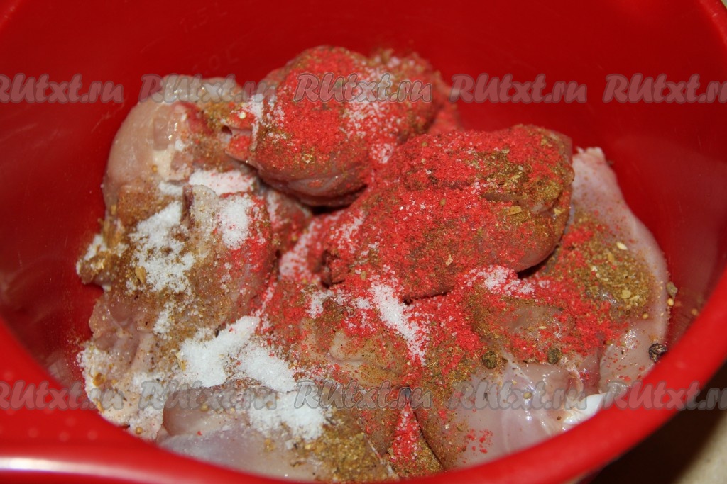 Добавить к ножкам соль, паприку и специи для курицы, тщательно перемешать и оставить мариноваться на 2 часа в прохладном месте.