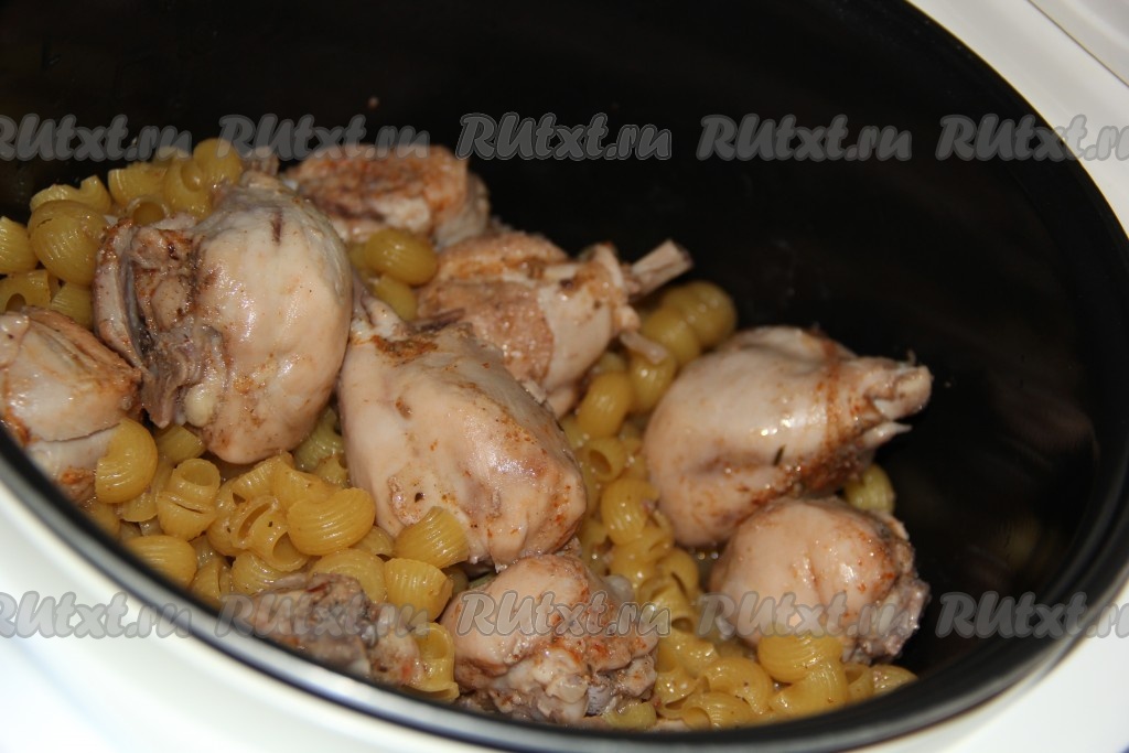 Всыпать сухие макароны в чашу к куриным ножкам.