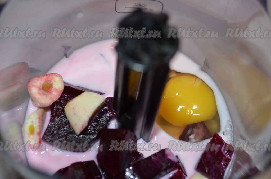 Молоко, яйцо, свеклу, чеснок, оливковое масло и соль измельчаем в блендере до однородной массы.