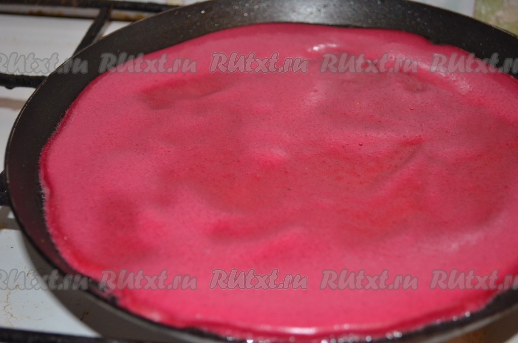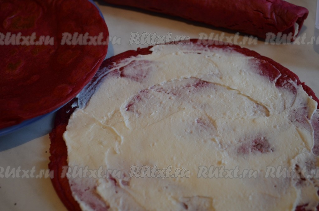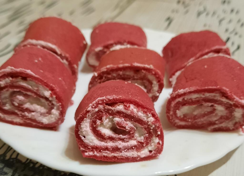 На каждый блин из свеклы намазываем творожную начинку, скручиваем трубочкой.