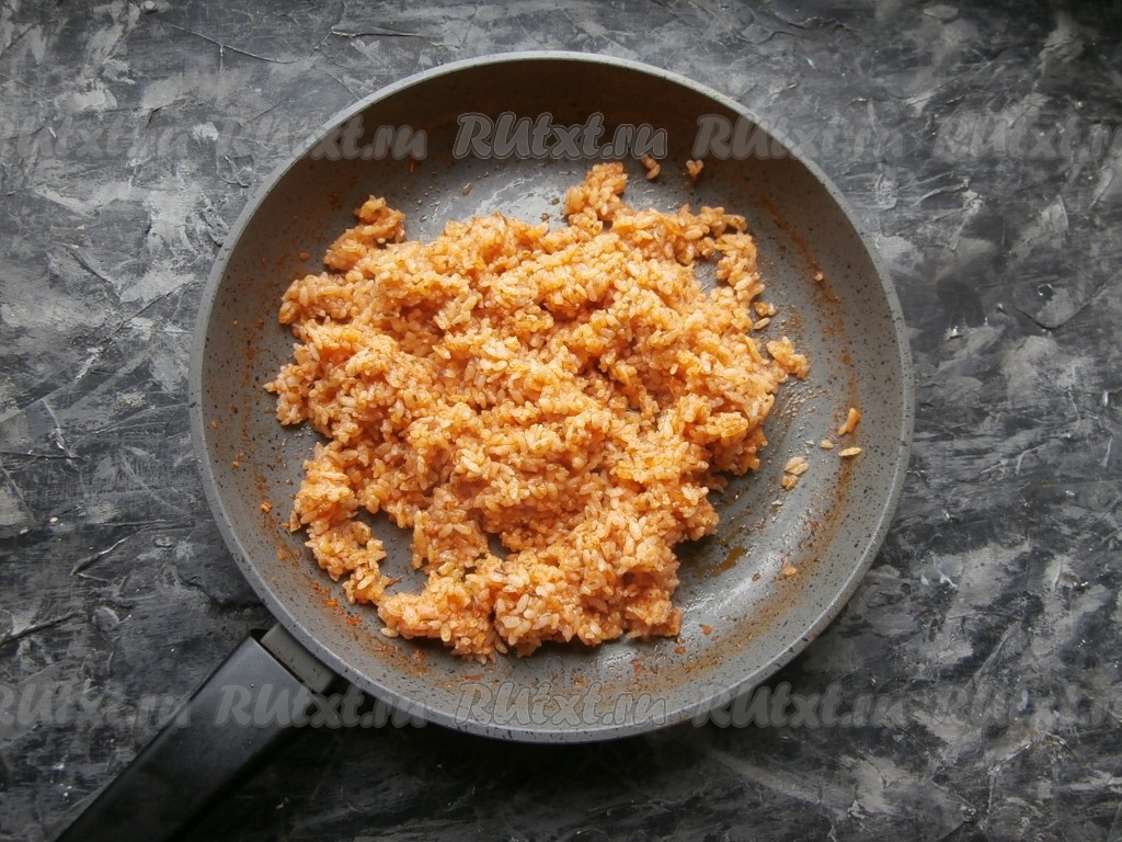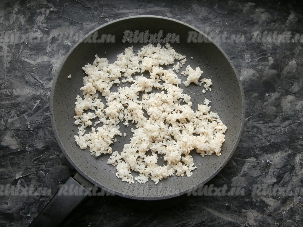 Рис обжарить на разогретом оливковом (или другом растительном) масле. Обжаривать рис нужно на среднем огне, перемешивая, до слегка золотистого цвета.