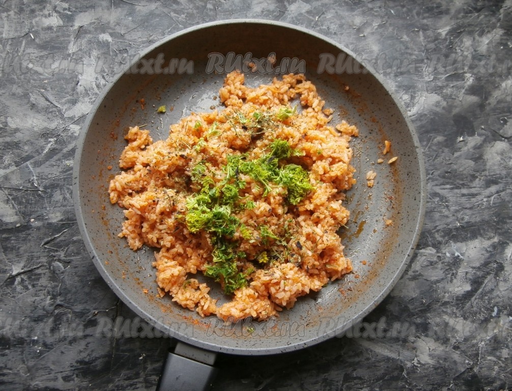 К рису с помидорами добавить измельчённую петрушку, перемешать и прогреть на огне ещё минуты 2-3.