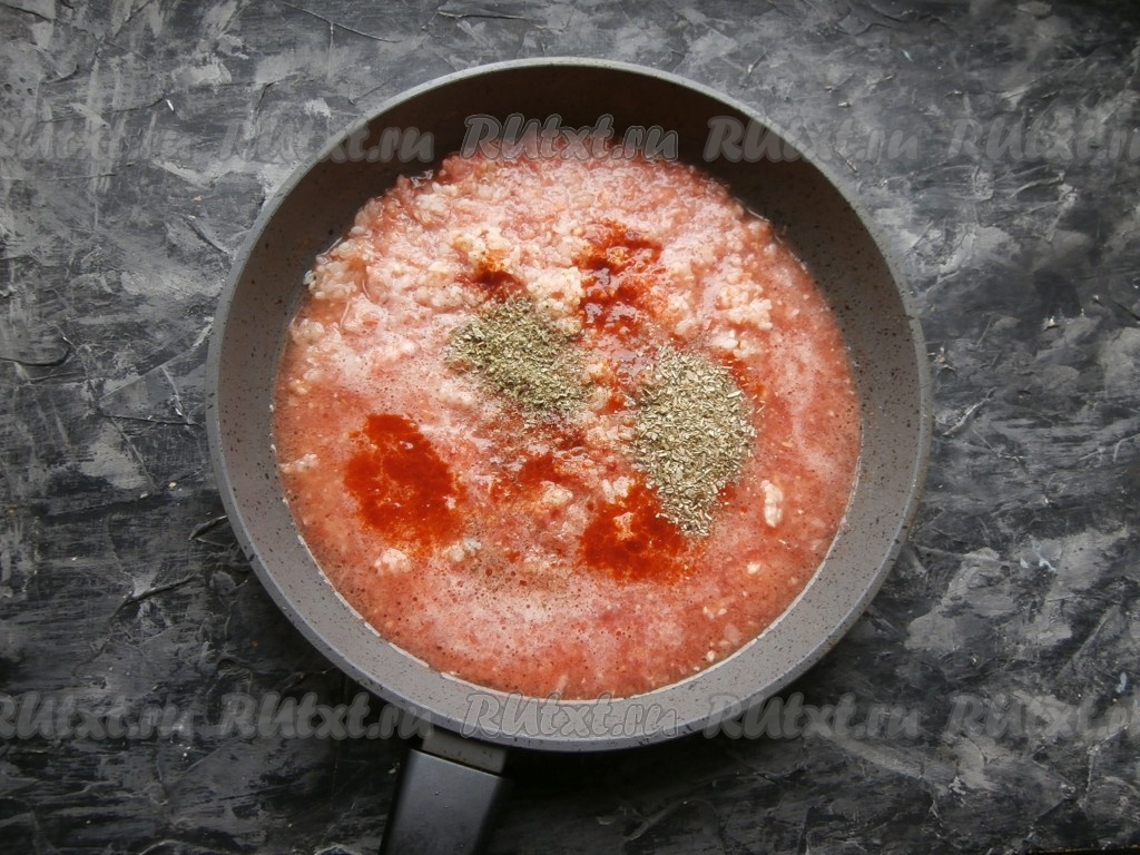 Всыпать соль, немного чёрного молотого перца, парику, сахар, майоран и орегано.