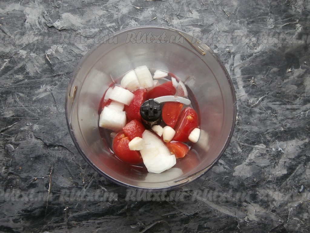 В чашу блендера поместить помидоры, чеснок, репчатый лук, влить 130 мл воды.
