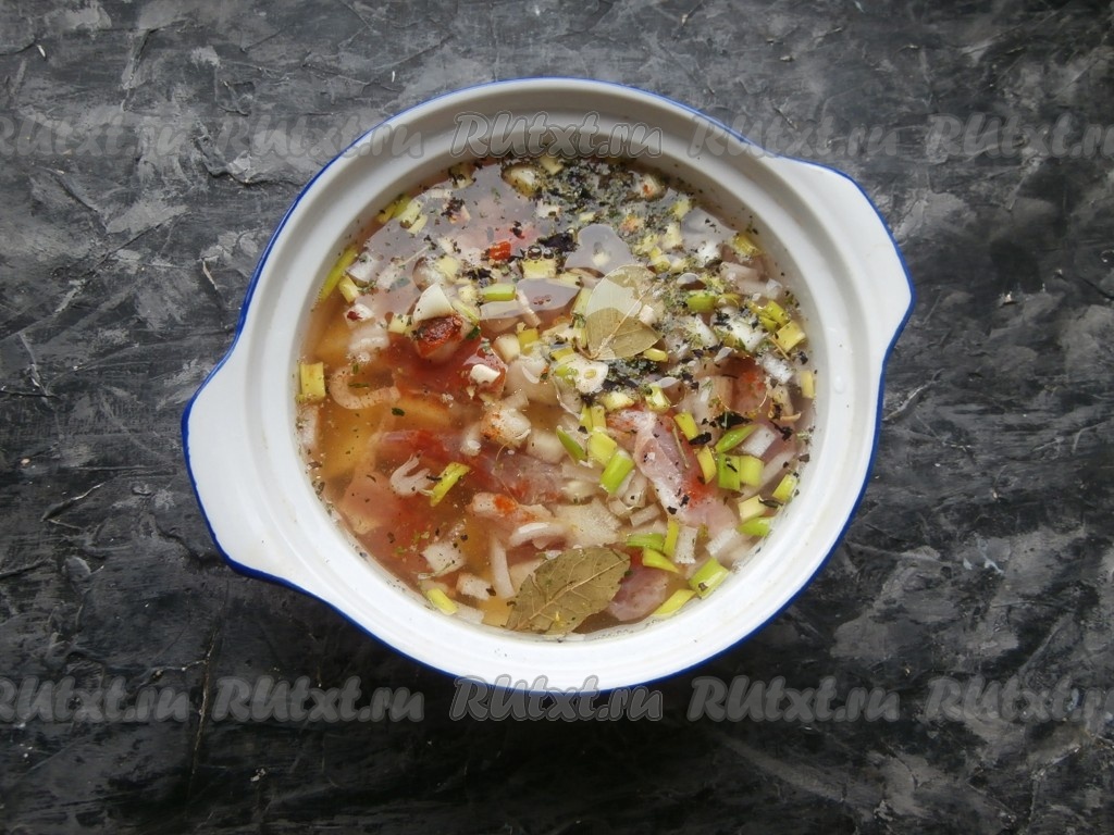Выложить нарезанные репчатый и зелёный лук, добавить лавровый лист и нарезанный кусочками чеснок, всыпать соль, специи, сушёную зелень, паприку.