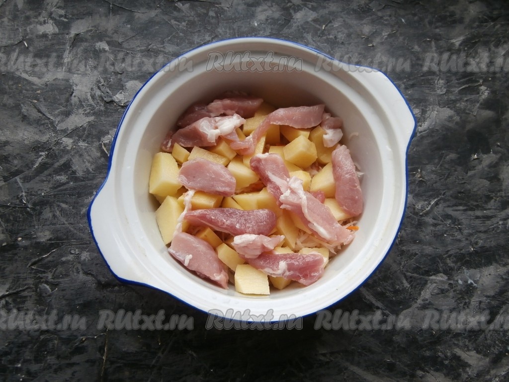 На капусту выложить нарезанный средними кусочками картофель и кусочки мякоти свинины.