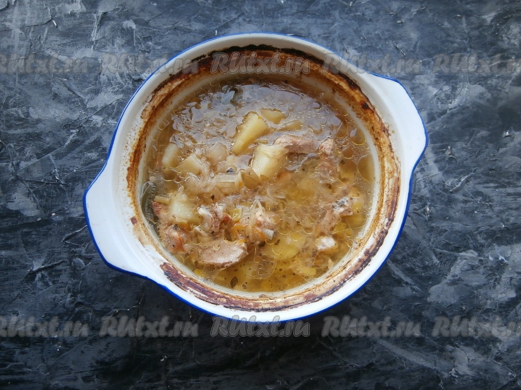 Накрыть кастрюлю крышкой и отправить в холодную духовку. Выставить температуру 180 градусов и включить духовку. Готовить щи из квашеной капусты 15 минут, после чего температуру убавить до 160 градусов и готовить блюдо далее ещё 1 час 15 минут.