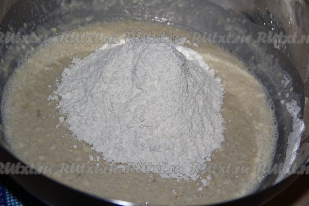 Всыпать половину муки, перемешать. А дальше добавляем муку небольшими порциями, каждый раз хорошо вмешивая её в тесто.