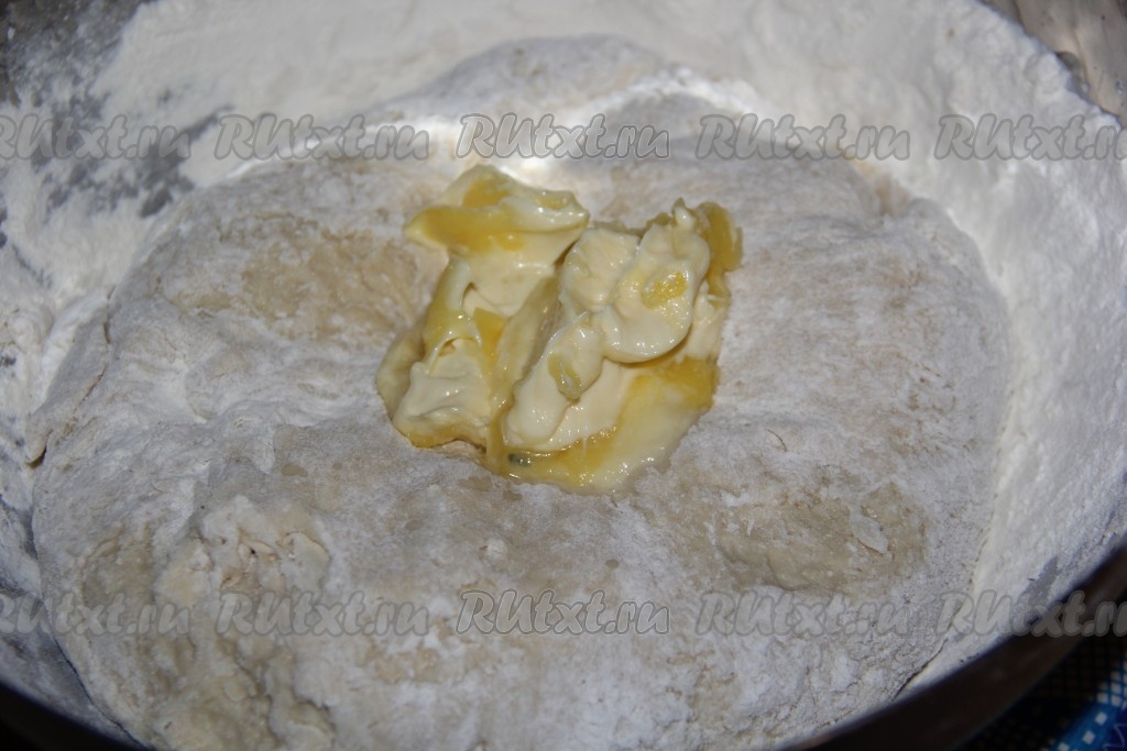 У меня ушло 450 грамм муки, тесто должно получиться слегка липким. Добавить 90 грамм размягчённого сливочного масла и соль.