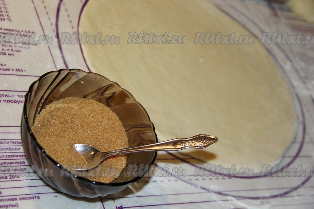Теперь займёмся начинкой, для этого в небольшой пиале нужно соединить сахар (у меня коричневый) и корицу, перемешать. Каждую часть теста раскатать скалкой в круг. У меня диаметр пирога 28 см.